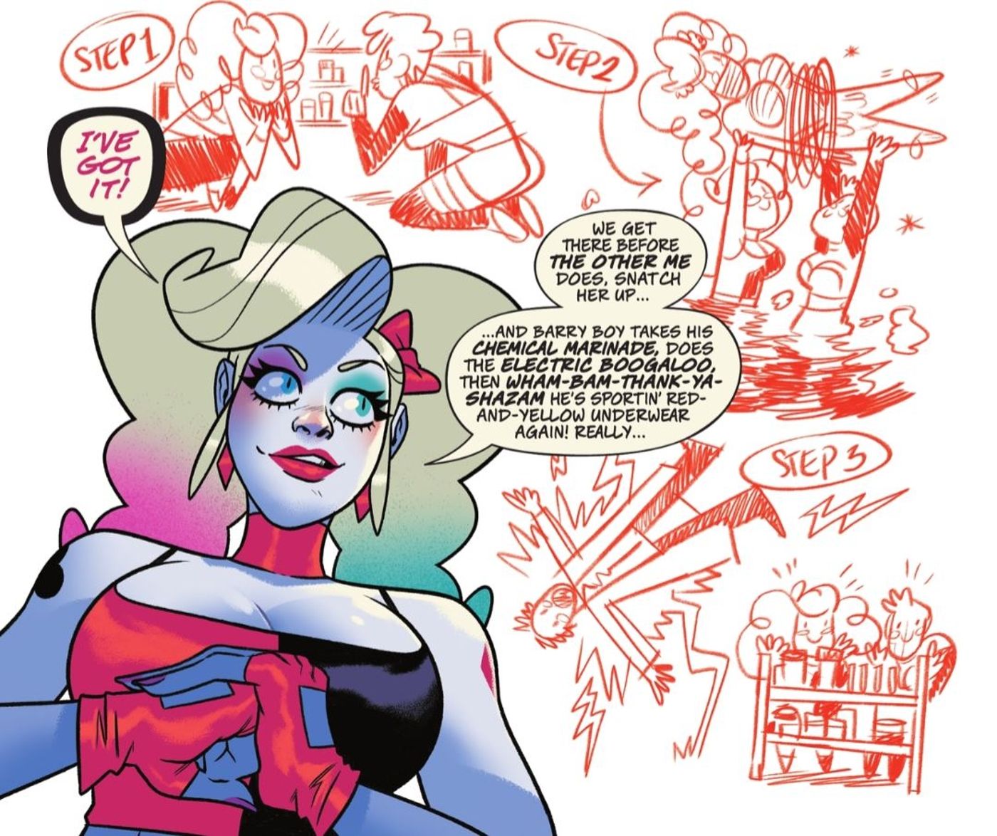 En Multiversity: Harley arruina la DCU #3, Harley y una variante de sí misma están tratando de arreglar la línea de tiempo después de que la Harley original la arruinara al borrar la Liga de la Justicia. Las recientes escapadas de Harley con una máquina del tiempo alteraron los orígenes de los miembros fundadores de la Liga, lo que significa que las dos Harleys deben regresar y arreglar cada una. Durante su viaje en el tiempo inicial, Harley destruyó los productos químicos que Barry Allen necesitaba para recubrir cuando le cayó un rayo.