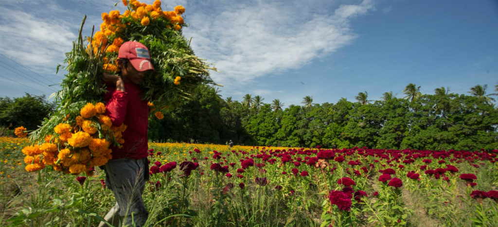 El corte de la flor amarilla y guinda ha comenzado desde muy temprano, Óscar junto con dos personas caminan entre los surcos invadidos de moscos y demás insectos, mientras que Blanca lo vende en la ciudad de Juchitán, donde las floristas lo adquieren por menudeo.