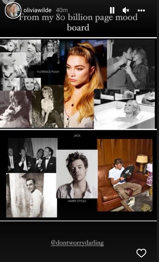 El tablero de humor de Wilde, que publicó como una historia de Instagram en su cuenta, revela parte de la inspiración detrás de Alice y Jack. Presenta instantáneas de Pugh y Styles, así como imágenes de íconos del entretenimiento de la década de 1950, como Frank Sinatra, Nat King Cole y Brigitte Bardot. Echa un vistazo a una captura de pantalla del moodboard a continuación: