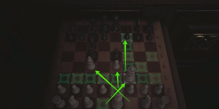 Baja las escaleras hasta el séptimo piso. En el pasillo habrá un juego de ajedrez sobre un gabinete blanco con algún tipo de mecanismo de bloqueo. Para ganar el Logro de gran maestro, los jugadores deben tomar el peón negro sentado en F7. Mueve las piezas en el siguiente orden: