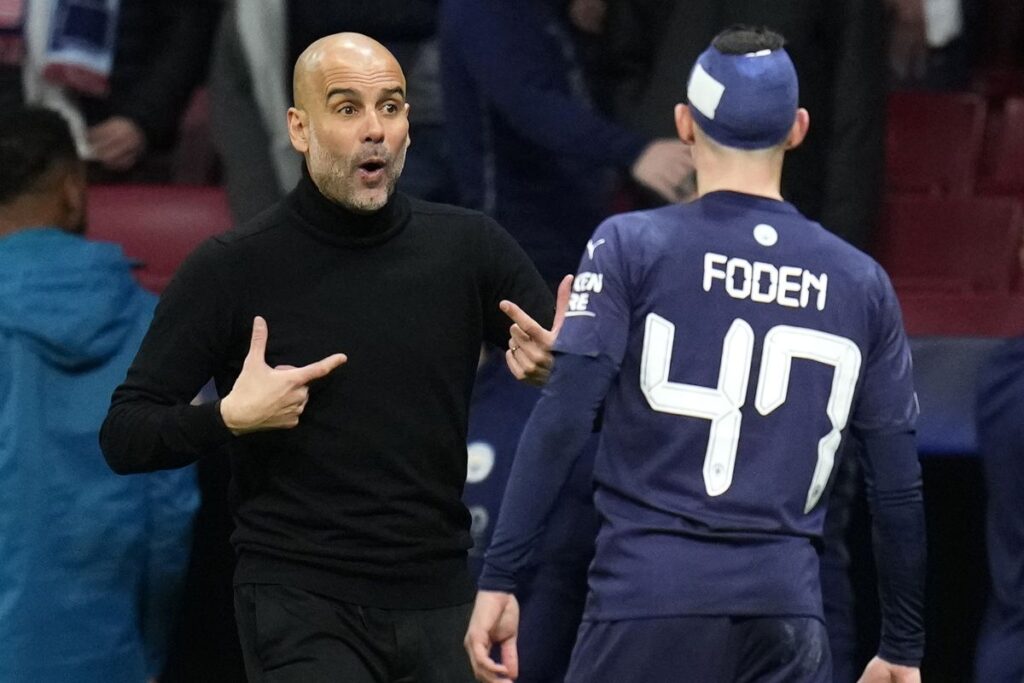Guardiola habla con Foden durante el Atlético-City.Manu Fernandez (AP)