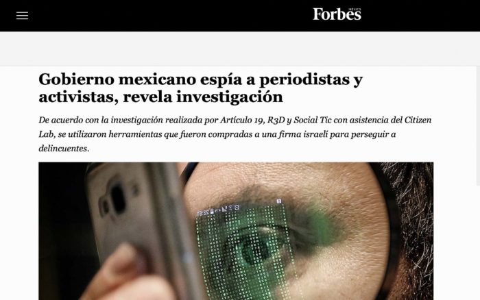 La nota en cuestión expone que “el gobierno mexicano (de Enrique Peña Nieto) espió a periodistas y activistas disidentes a través de herramientas que fueron compradas a una firma israelí para perseguir a delincuentes, reveló una investigación realizada por diferentes organizaciones civiles”.