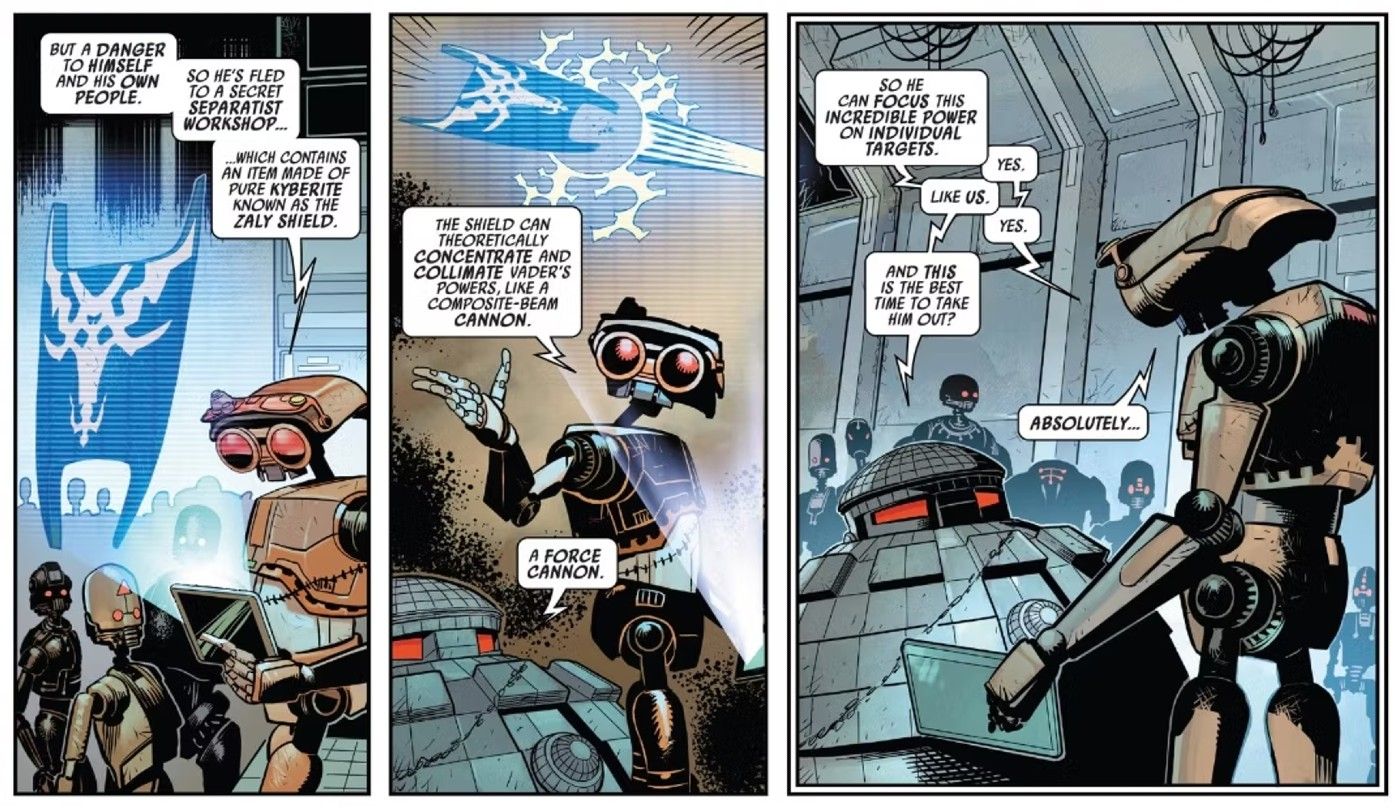 En medio de la formulación de un complot para emboscar y asesinar al Señor Oscuro de los Sith, Gee-Ninety llama a la última arma de Vader precisamente por lo que es: un “Cañón de fuerza”. El número anterior de la serie, Darth Vader #35, presentó Kyberite, el mineral del que crecen los cristales Kyber. Los cristales Kyber, por supuesto, son la fuente de energía de los sables de luz, debido a su capacidad natural para concentrar la Fuerza. En el número 35, Vader busca respuestas cuando sus poderes de la Fuerza se salen de control. Su solución viene en forma de un escudo Kyberite, que Vader puede usar para concentrar sus habilidades excesivas. El resultado es una de las mejoras más significativas a sus poderes de la Fuerza en la historia de Guerra de las Galaxias.