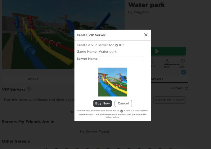 Para crear un servidor VIP, primero visita la página del juego individual en Roblox, luego haz clic en la pestaña “Servidores” y luego en el botón “Crear servidor VIP”. Dé un nombre a su servidor, luego invite a otros a través del enlace proporcionado. (Tenga en cuenta que esto le permite optar por una suscripción, por lo que deberá cancelarla una vez que finalice la fiesta, a menos que desee conservar la opción de tener espacios de juego privados como este en el futuro).