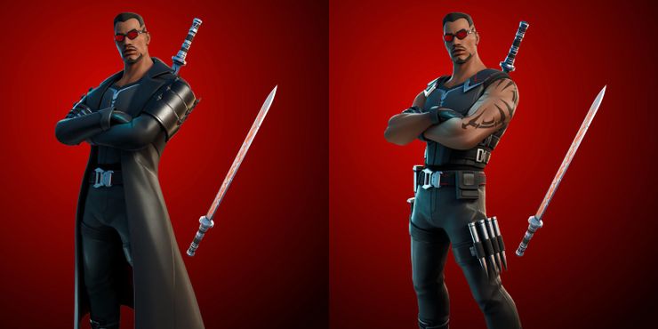 Blade viene con su famoso estilo de gabardina, pero eso se puede cambiar a sus tatuajes de brazos deportivos de diseño exclusivo de chaleco. Ambas versiones presentan las gafas de sol rojas del cómic y su herramienta de recolección es, por supuesto, la espada de punta plateada que le da nombre.
