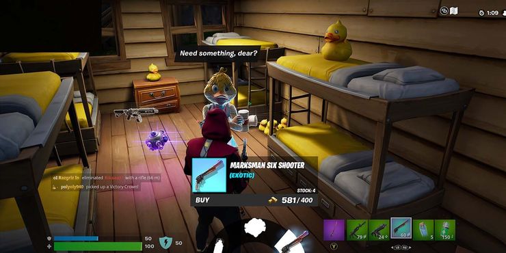 Los últimos tres exóticos para esta temporada son un grupo de pistolas, cada una con un valor de 400 barras. Primero, la pistola Shadow Tracker, que es una pistola silenciada que hace daño y también hace ping a los enemigos que golpea. Se puede comprar en exclusiva en Fortnite‘s Camp Cuddle de Metal Team Leader o Cuddlepool. La próxima pistola, Marksman Six Shooter, también es exclusiva de Camp Cuddle. Es un revólver de alta cadencia y fuego y daño que venden Cuddle Team Leader y Quackling. Finalmente, Night Hawk Pistol es un revólver con mira telescópica con un daño increíblemente alto, y solo se encuentra en Sanctuary o The Joneses. The Night Hawk es vendido por The Origin y Brainiac.