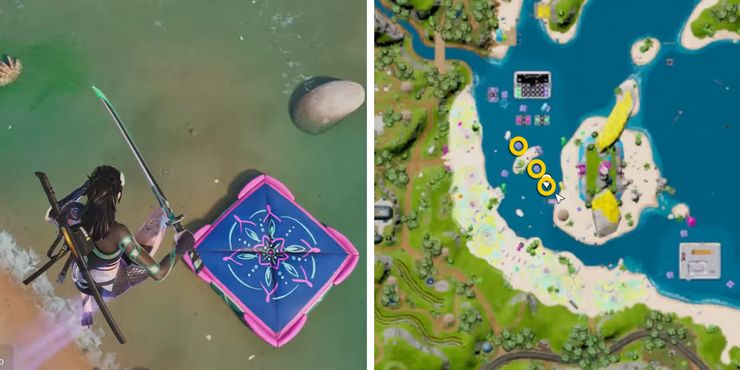 Alternativamente, usando Environmental Crash Pads para completar esta Week 9 Quest en Previsto es un método mucho más fácil. Estas variantes ambientales se pueden encontrar flotando en el agua alrededor del Monumento Poderoso, al este del Santuario. Después de aterrizar o llegar al lugar, nade hasta las plataformas y salte del agua a una de las plataformas. Rebote con cuidado de uno a otro; la ruta más fácil es la fila de tres Crash Pads que comienza cerca de las costas sureste de la isla de Mighty Monument, donde los jugadores eliminaron los signos de No Sweat en Fortnite. La ubicación exacta es en la playa norte de la pequeña isla cercana sin nombre. Tenga cuidado con los jugadores hostiles cercanos, ya que el participante de la misión será bastante vulnerable al saltar de un trampolín a otro.