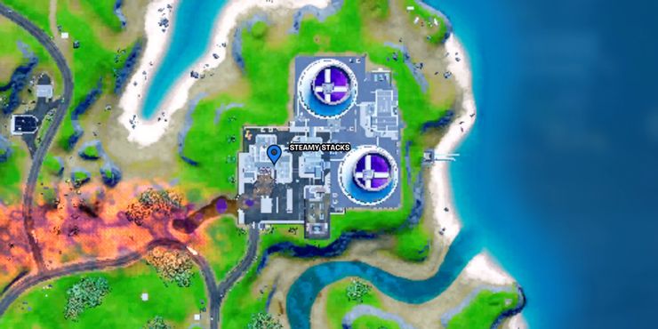 Al comienzo del partido, Fortnite los jugadores deben concentrarse en aterrizar en Steamy Stacks. Dark Jonesy deambulará por el extremo occidental de este parque industrial. Después de aterrizar, acércate y habla con él para comenzar su primer desafío.