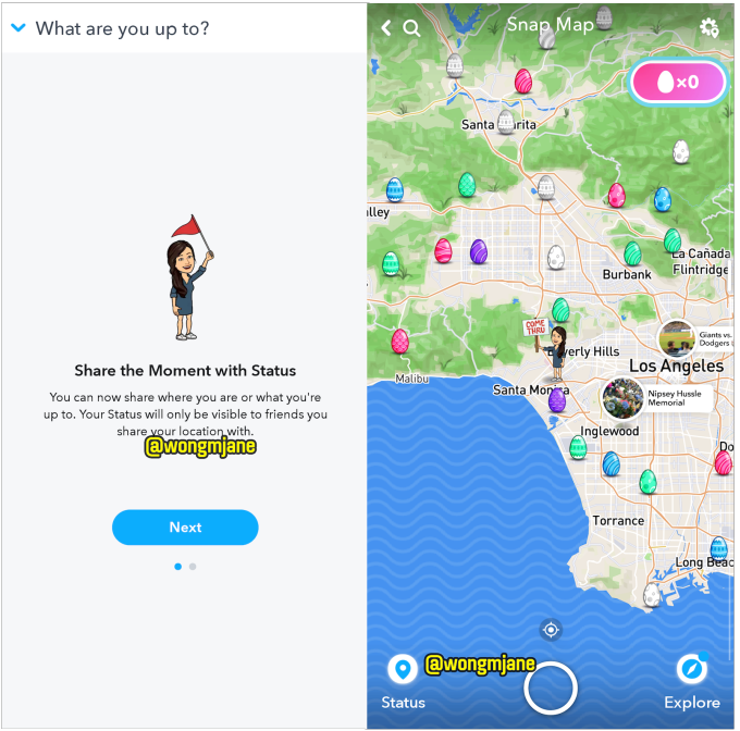 Snapchat Status y Passport fueron vistos por primera vez por un experto en ingeniería inversa y por el frecuente tipster de TechCrunch Jane manchun wong. "Comparta el momento con el estado", explica la introducción a la función. "Ahora puedes compartir dónde estás o lo que estás haciendo. Tu estado solo será visible para los amigos con los que compartas tu ubicación ". Para ver tu estado, eliges entre una gran cantidad de posturas para tu Bitmoji que van desde la lectura de un libro hasta la celebración de un cartel que dice" ¿enviarme un mensaje de texto? "