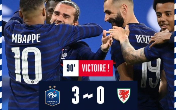 El partido fue casi perfecto para la vigente campeona del mundo, que a los 26 minutos veía cómo se le ponía de cara el partido tras la expulsión de Neco Williams en un penalti. Benzema no pudo transformarlo en el único lunar de los franceses, pero sí gozó de varias oportunidades que convirtieron su vuelta en un buen regreso. Cinco minutos después marcó Kylian Mbappé tras aprovechar un rechace.