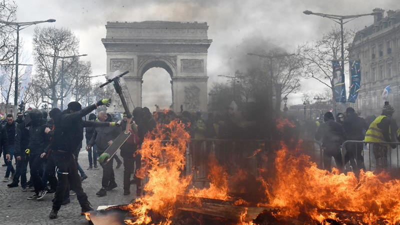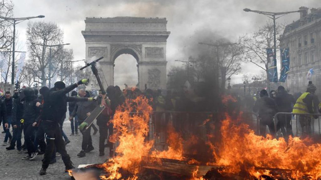 Los manifestantes franceses de chalecos amarillos provocaron incendios, destruyeron vitrinas de tiendas de lujo y se enfrentaron a la policía este sábado en la decimoctava manifestación contra el presidente Emmanuel Macron. Grandes columnas de humo se elevaron sobre los disturbios en la icónica avenida de los Campos Elíseos de París, y una madre y su hijo apenas fueron salvados de un incendio en un edificio.