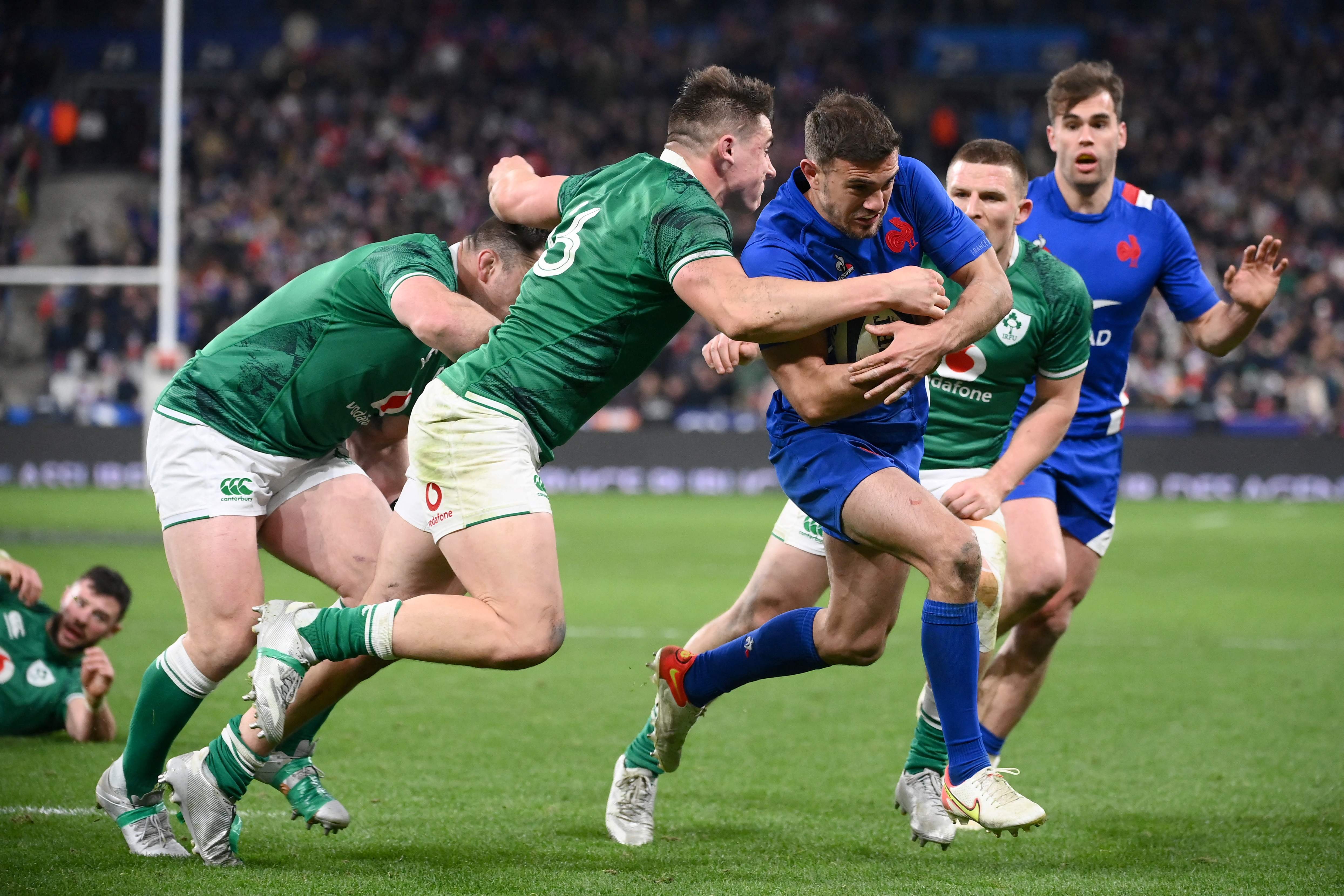 La tradición hablaba de duelo entre defensas, pero el inicio en el Stade France fue frenético, con 17 puntos en ocho minutos. El primer puñetazo lo asestó Francia en un ataque acelerado por un saque de touch que sorprendió a Irlanda, descompuesta después por una carga de Atonio y sus 155 kilos. En esas, la dupla letal Ntamack-Dupont se asoció para que el segundo ensayara a los 68 segundos de juego. El XV del Gallo amplió su ventaja con una patada a palos de Jaminet, pero se vio sorprendido en un despiste improbable. La trasera azul no vio la llegada de Mack Hansen, que cazó la patada de centro de Carbery y corrió feliz hacia el ensayo.