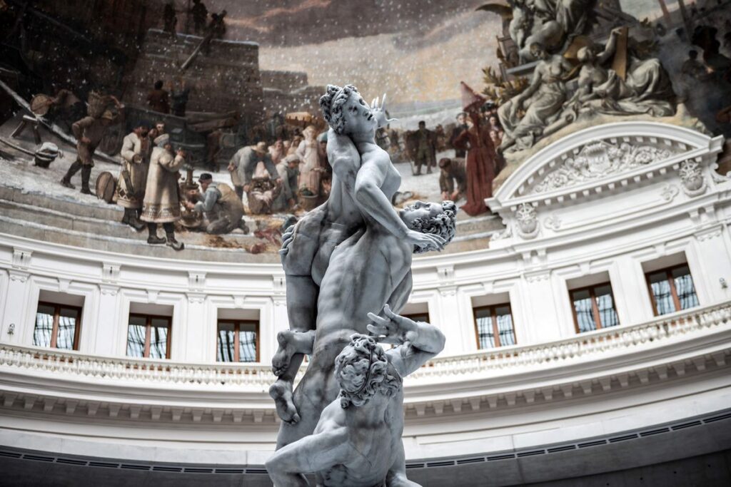 Las obras expuestas en los más de 10.000 metros cuadrados de la antigua lonja de grano, elegidas una a una por el propio Pinault —”desde el principio ha venido prácticamente todos los días”, cuenta Cyrielle André, una de las mediadoras culturales del centro—, persiguen una reflexión sobre los temas que le obsesionan y que se reflejan en sus adquisiciones: se cuestiona lo efímero, idea escenificada sobre todo con la gigantesca escultura de cera del suizo Urs Fischer, emulando El Rapto de las Sabinas de Florencia que se fundirá poco a poco —ya le faltan dos dedos a una de las figuras—, que ocupa el espacio central de la rotonda de la Bolsa de Comercio. Pero se indaga también en las problemáticas de la sociedad actual, desde “cuestiones políticas a culturales o de identidad de género”, como explica días antes de la apertura el director general del centro, Martin Bethenod.