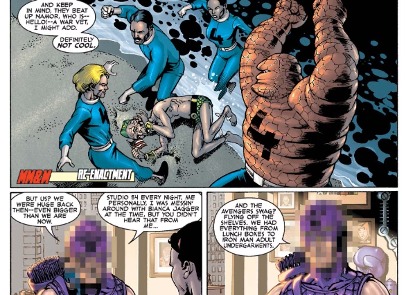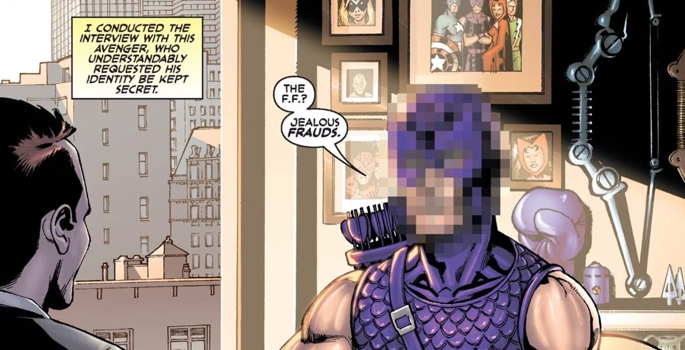 Para impulsar esta narrativa, el programa de noticias mantiene entrevistas sinceras con héroes y villanos anónimos en el cómic. por Frank Tieri, Juan Santacruz, Ángel Marín y Nate Piekos. Entre estas entrevistas se encuentra un miembro de los Vengadores. Aunque su rostro está oculto y se le garantiza el anonimato, los lectores pueden ver por el uniforme y el telón de fondo que el Vengador no es otro que Hawkeye (interpretado por Jeremy Renner en el MCU). Hawkeye ofrece un mordaz resumen de lo que realmente siente por Marvel. primera familia, alegando que son esencialmente fraudes.