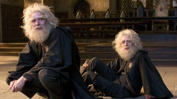 James y Oliver Phelps, los actores que interpretaron a Fred y George Weasley, respectivamente, discuten la escena en la que los gemelos Weasley intentan colocar sus nombres en el cáliz de fuego e ingresar ilegalmente al Torneo de los Tres Magos a pesar de ser menores de edad. Para derrotar la línea de edad mágica que Dumbledore trazó alrededor del cáliz de fuego, un hechizo que prohibiría a cualquiera de los estudiantes menores de 17 años participar en la competencia, Fred y George toman una poción de envejecimiento para sortear las reglas. Como predijo Hermione Granger (Emma Watson), el encanto de Dumbledore hace que la poción sea contraproducente y transforma a los gemelos en ancianos. Según James y Oliver, Newell quería que se comprometieran más con la escena y decidió manifestarse peleando con uno de los actores.