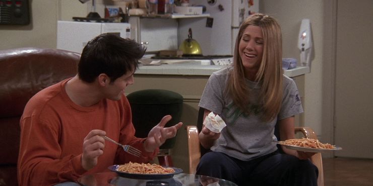 Joey le dice que no importa y deliberadamente deja caer espaguetis en la alfombra también para demostrarlo. Rachel está naturalmente encantada, después de haber estado acostumbrada a limpiar a Monica durante años, y pronto comienza a divertirse mucho viviendo con Joey, tanto en este episodio como en el futuro. Aunque su relación romántica es una Amigos A los fanáticos de la historia les gustaría ver un corte, su amistad es una de las mejores de la serie.