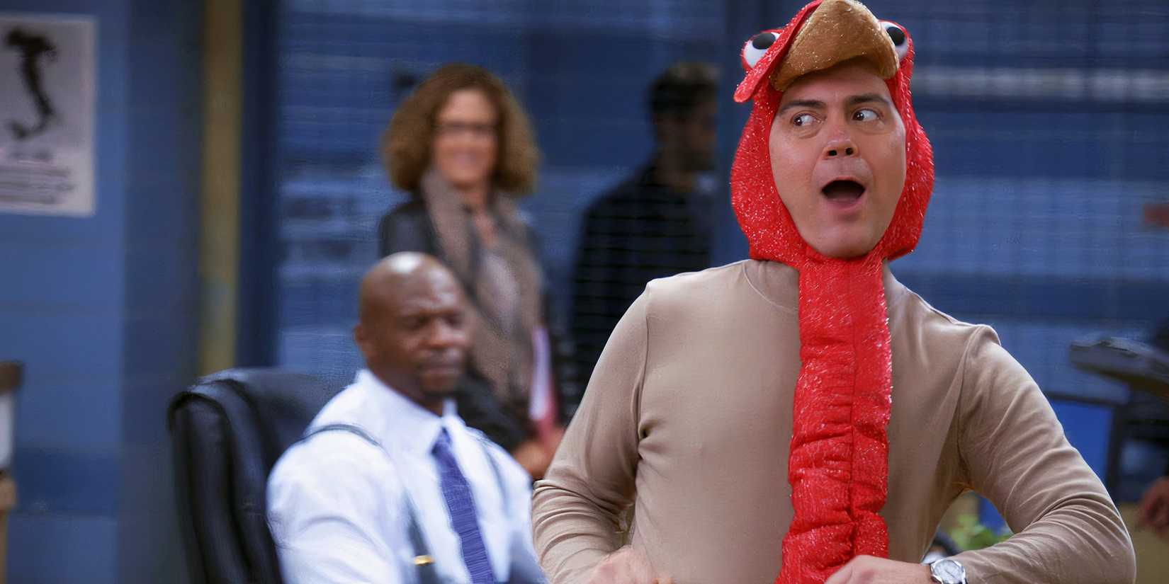 Brooklyn nueve y nueve abraza la naturaleza única del Día de Acción de Graciasa menudo centrándose en reuniones familiares y nuevas presentaciones. En la temporada 4, el juvenil detective de Andy Samberg, Jake Peralta, está tan nervioso por conocer al padre de su novia que alquila un auto nuevo después de limpiar el viejo “no tomó.” El adorable bicho raro aficionado a la comida interpretado por Joe Lo Truglio, Charles Boyle, llega con un pavo vivo para prepararse para el festín, creando una división moral entre quienes quieren comérselo y quienes quieren prescindir de él. Incluso la trama C se relaciona con el espíritu de Acción de Gracias, cuando dos personajes hacen una apuesta en la exposición canina anual de Acción de Gracias.