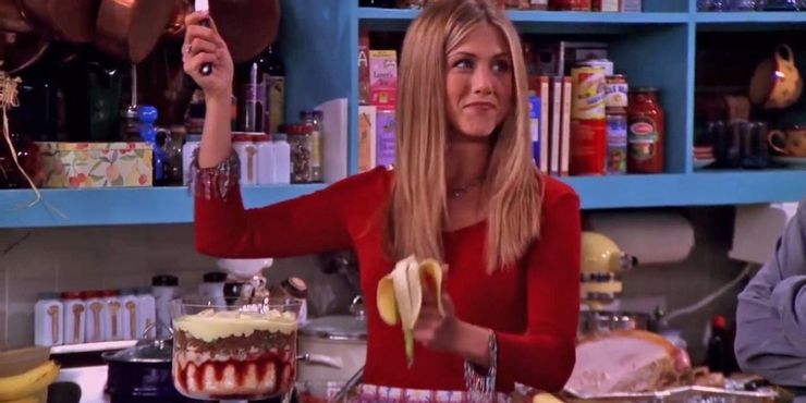 Los episodios de Acción de Gracias son siempre algunos de los episodios más populares y, por lo general, Monica se encarga de la comida para todos. En “El de donde Ross se drogó”, Monica le confiere las responsabilidades del postre a Rachel, y ella está haciendo una bagatela en inglés. Mientras Rachel piensa que está siguiendo la receta correctamente, las páginas se atascan y accidentalmente agrega carne salteada con guisantes y cebollas.