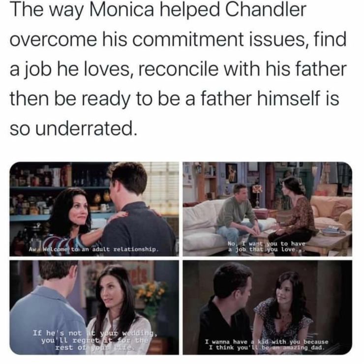 Si bien este meme describe los problemas de Chandler con las relaciones serias, también señala que la pareja era perfecta el uno para el otro y estaba lista para casarse cuando llegara el momento. Chandler claramente tuvo problemas de compromiso antes que Monica, pero también está bastante claro que su relación es algo único.