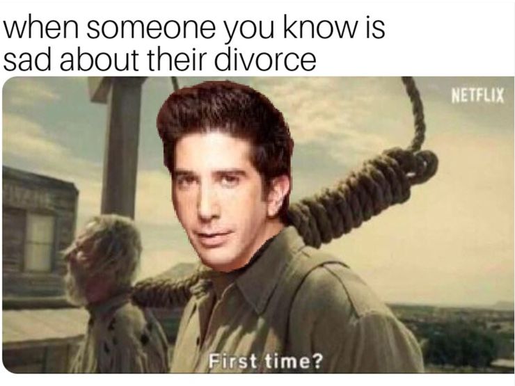 Este meme de Reddit es perfecto para este episodio porque resume a la perfección uno de los chistes más antiguos de la serie. Ross se casa y se divorcia tres veces dentro de su historia, y su matrimonio con Emily termina incluso antes de que comenzara.