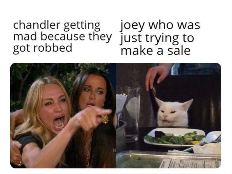 En este episodio, Joey está tratando de vender el centro de entretenimiento que hizo cuando alguien lo encierra dentro de los muebles y se lleva todas sus cosas. Este meme no solo es perfecto porque es una representación de su amistad, sino que demuestra cuán divertidas son las reacciones de ambos ante la situación.