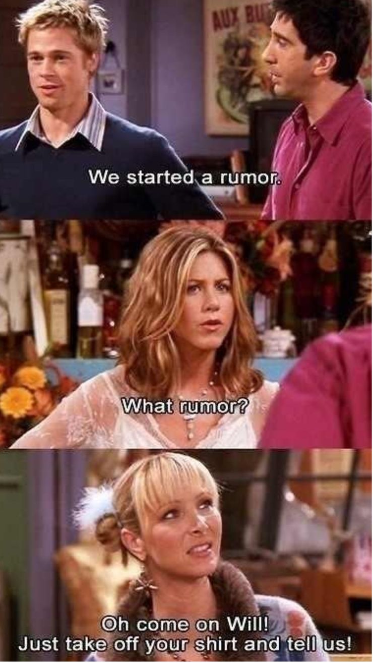 Este meme de twitter es un ejemplo de cómo los personajes pueden soltar algunas de las líneas más ridículas incluso en los momentos más serios. Cuando Will y Ross mencionan cómo comenzaron un rumor sobre Rachel, Phoebe decide intervenir de una manera completamente inútil pero divertida.