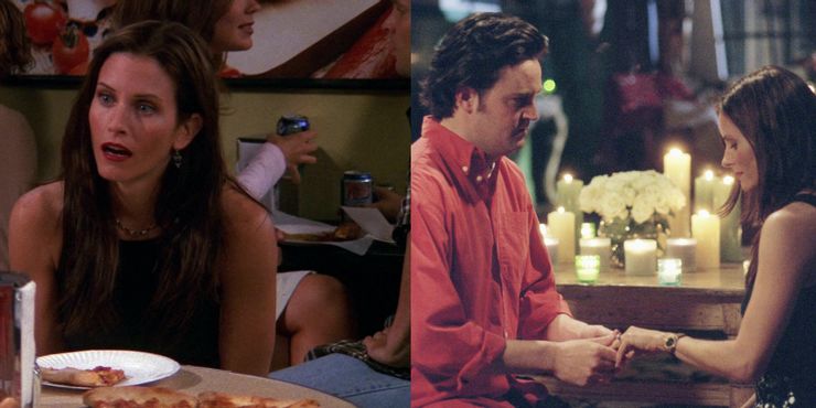 “The One With The Proposal” se divide en dos partes, pero el mejor momento ocurre en la segunda parte. Después de un ir y venir de Monica cuestionando su relación y Chandler demasiado asustado e inseguro de cómo hacer la propuesta, los dos finalmente se encuentran en el apartamento iluminado por velas de Monica. Ella está de rodillas, lista para proponerle matrimonio en lugar de él, pero está demasiado emocionada para pronunciar las palabras. Chandler se une a ella en el suelo y juntos se confiesan su amor mutuo.