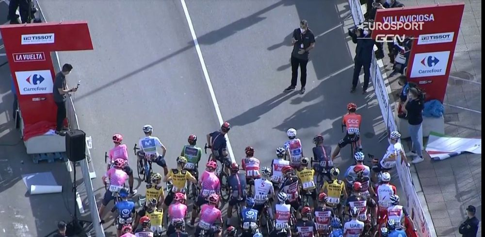 Pese a terminar en un repecho al 5%, el reglamento de la Vuelta la clasificó como de llegada al sprint. Para ellas, la norma de la Unión Ciclista Internacional (UCI), estipula que tiene que haber un hueco de al menos tres segundos entre dos ciclistas para aplicarles la diferencia de tiempo. Por eso se logra que en las llegadas al sprint todos los concurrentes terminen con el mismo tiempo del primero. Y, repasando las imágenes de la llegada, se aprecia que en ningún momento hay tres segundos entre los ciclistas que cruzan poco a poco la meta en el primer pelotón. Y, de hecho, en la primera clasificación que libera el jurado, no hay diferencias de tiempo entre los 29 primeros. Solo a partir del 30ª, Bol, se aplica un retraso de 15s. Así, Carapaz seguía siendo líder por 3s. Pero pocos minutos después, el jurado da marcha atrás y pica los 3s de ida y vuelta. “Lo hemos hecho porque, vista la llegada, es más de justicia deportiva picar tiempo si hay un hueco de un segundo entre los ciclistas”, le explicó el presidente del jurado, Simon, a José Luis de Santos, el presidente del sindicato de ciclistas, que le llamó para informarse. “Y, como bien sabéis, todas las normas tienen una coletilla que nos deja a los comisarios discreción para aplicarlas según nuestro criterio”. Y De Santos le respondió: “Pero eso no se puede hacer así, no se pueden cambiar las reglas del juego después de terminada la partida, porque muchos corredores pensando en la regla de los 3s no hicieron el máximo para acercarse en la llegada”.