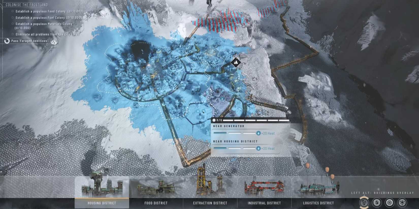 Por ejemplo, colocar los distritos de vivienda y alimentos cerca uno del otro es beneficioso, pero Construir edificios cerca de distritos de extracción, industriales o logísticos promoverá la propagación de suciedad y enfermedades.. A su vez, esto afectará la salud de los residentes e incluso puede provocar la muerte. De manera similar, Los mosaicos lejanos resaltados en rojo también marcan condiciones desfavorablesque normalmente requieren más calor para mantenerse. Evite construir en estas áreas para mantener la confianza y garantizar que la gestión del calor sea lo más eficiente posible.