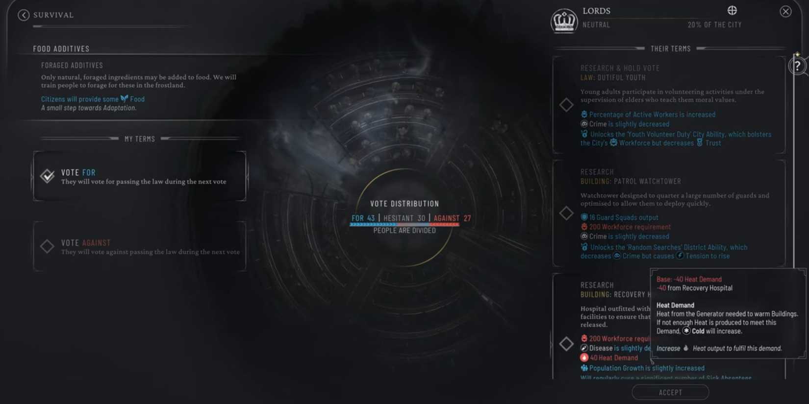 La elaboración de leyes puede ser decisiva para mejorar la civilización, y la producción de calor es solo una parte de lo que está en juego. Si bien existen ventajas evidentes en la aprobación de leyes para reducir la demanda de calor, También hay desventajas que tener en cuenta Como sus decisiones afectan únicamente a los distritos, solo uno de los nuevos sistemas en Frostpunk 2Vale la pena considerar las siguientes leyes para suavizar el impacto de la demanda de calor: