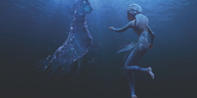 En las primeras etapas del remolque, se ve a Elsa tratando de convertir las olas del océano en hielo para que pueda correr a través del agua. Es contraproducente, como lo hizo en el primer tráiler, y ella se encuentra debajo de la superficie tratando de averiguar qué fue lo que salió mal. Aquí es donde se encuentra con un ser mítico que parece estar hecho de hielo, mirándola fijamente en el agua. Desaparece y luego aparece una vez más, burlándose de sus diversos poderes.