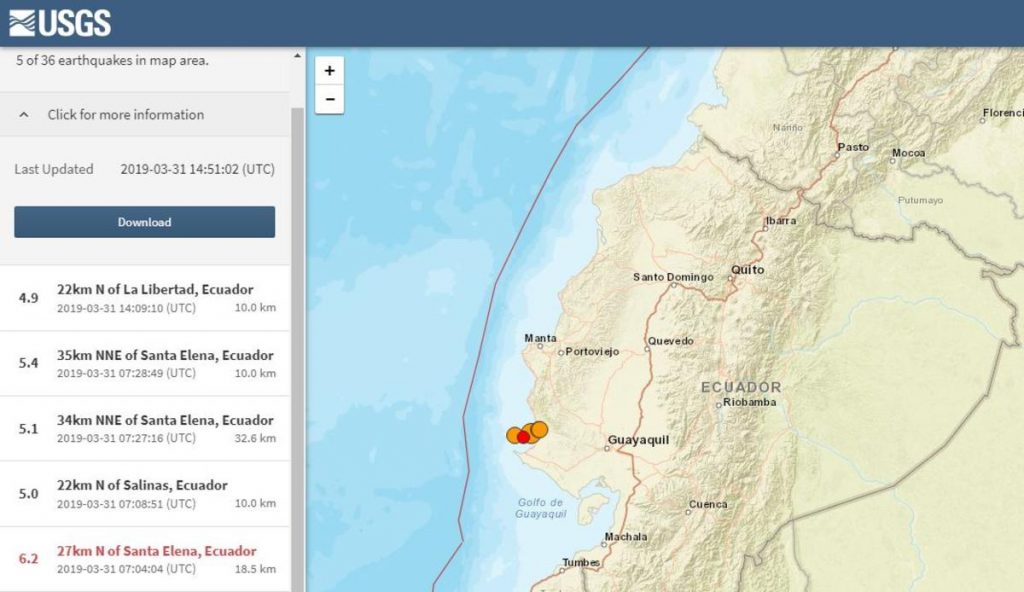 El Instituto Geofísico (IG) de Ecuador reveló en un primer comunicado que poco después de las 2 a.m. “se han registrado varios eventos en la costa central: el primero, costa afuera de la provincia de Santa Elena y el segundo en la provincia de Guayas”.