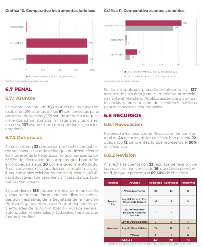 El documento señala que, entre diciembre de 2018 y agosto de 2019, se presentaron ante las diferentes instancias de la Secretaría un total de 20 mil 504 denuncias en toda la administración pública federal.