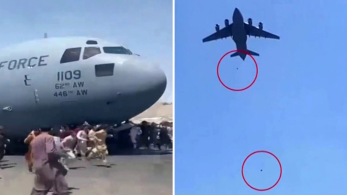 Vídeos difundidos en las redes sociales mostraron un avión militar estadounidense tipo C-17, del que se desprenden varios cuerpos en el aire, lo que, según testigos, se trataba de personas que se aferraron al exterior del avión antes de despegar.