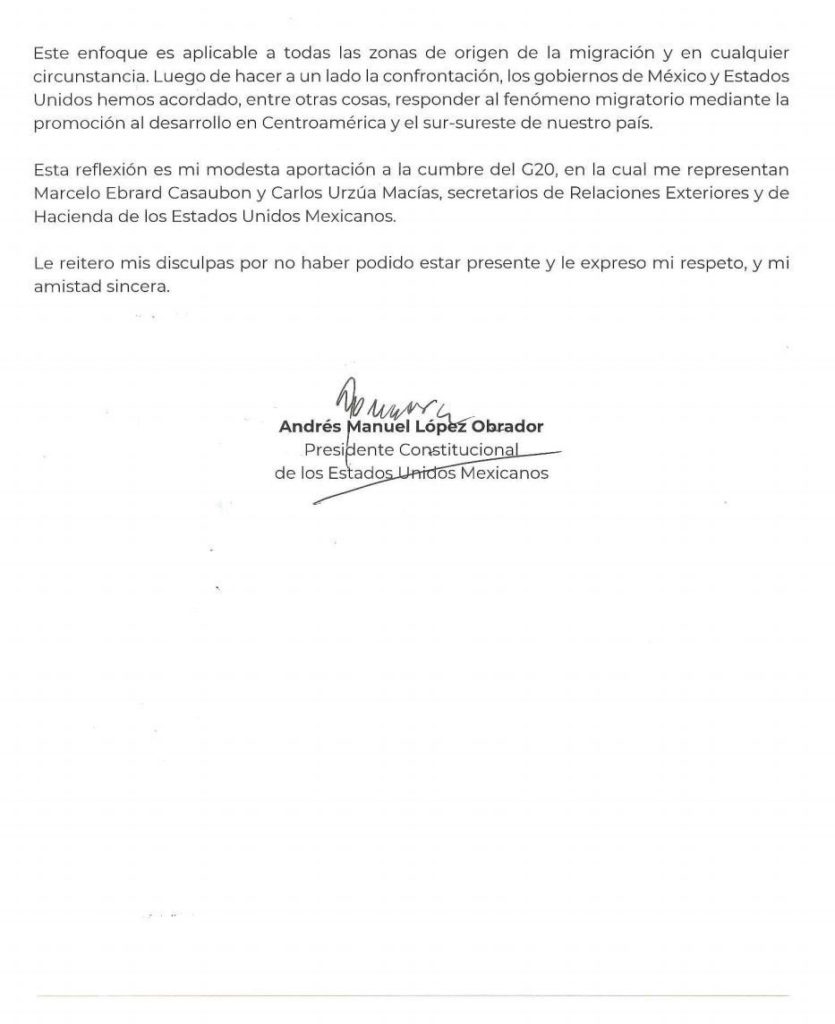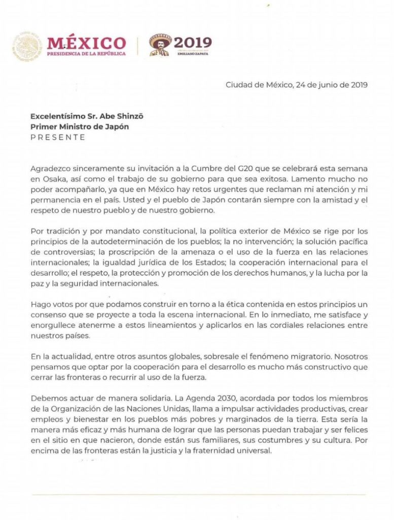 Del titular de la SRE destacó que en la cumbre en Osaka “presentamos la tesis mexicana sobre migración, se le entregó a todos (los participantes) la carta del presidente López Obrador que dice que debemos actuar respecto a las causas de los grandes movimientos migratorios y de refugio que se viven el mundo”.
