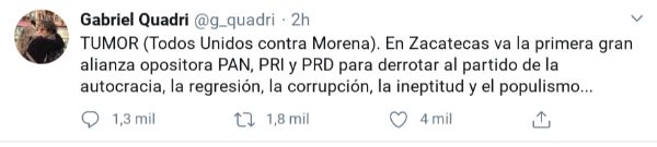 A través de su cuenta personal de Twitter, Quadri reveló que se llamaría Todos Unidos contra Morena, o Tumor.