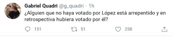 Momentos después, publicó otro tuit, en el que cuestiona si algún ciudadano que no votó por Andrés Manuel López Obrador se encuentra arrepentido de su decisión, y si, en retrospectiva, hubiera votado por él.