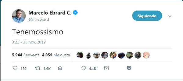El tuit de “Gracias Diego” ha sido marcado como favorito por mil 327 personas hasta las 18:00 horas de este viernes, pero se encuentra lejos de uno de los tuits más populares del actual canciller, el famoso “Tenemossismo” del 15 de noviembre de 2012. Aquel día Marcelo Ebrard omitió el espacio en la frase que utilizó para notificar a la ciudad que aún gobernaba, sobre un temblor de intensidad 6.1.