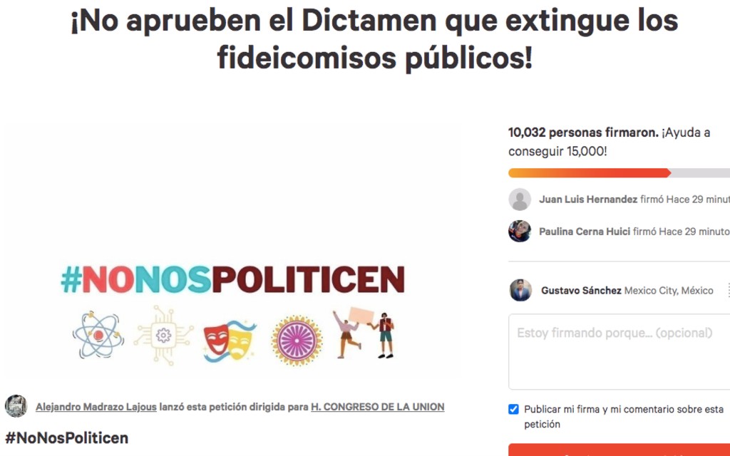 En la petición para evitar que se apruebe su desaparición se indica que “si desaparecen los fideicomisos públicos, la ciencia y la tecnología, el cine y la cultura, la reparación a víctimas, la protección de periodistas y personas defensoras de derechos humanos -entre otros temas- quedarán sujetos a los ciclos políticos y al criterio de los políticos. En otras palabras, si aprueban el Dictamen la ciencia, la cultura, el periodismo y los derechos humanos van a quedar sometidos al capricho de la política”.