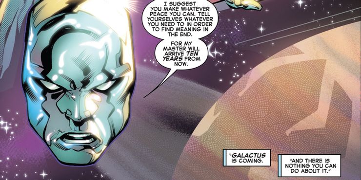 En el Los cuatro fantásticos: historia de vida universo, Silver Surfer ha llegado a la Tierra y da la última advertencia sobre Galactus. En el cómic, el Heraldo de Galactus pronuncia un discurso devastador sobre la intención de su maestro en la Tierra, advirtiendo a los habitantes del planeta que tienen diez años antes de que destruya todo en nombre del equilibrio cósmico, y no hay nada que puedan hacer al respecto. .