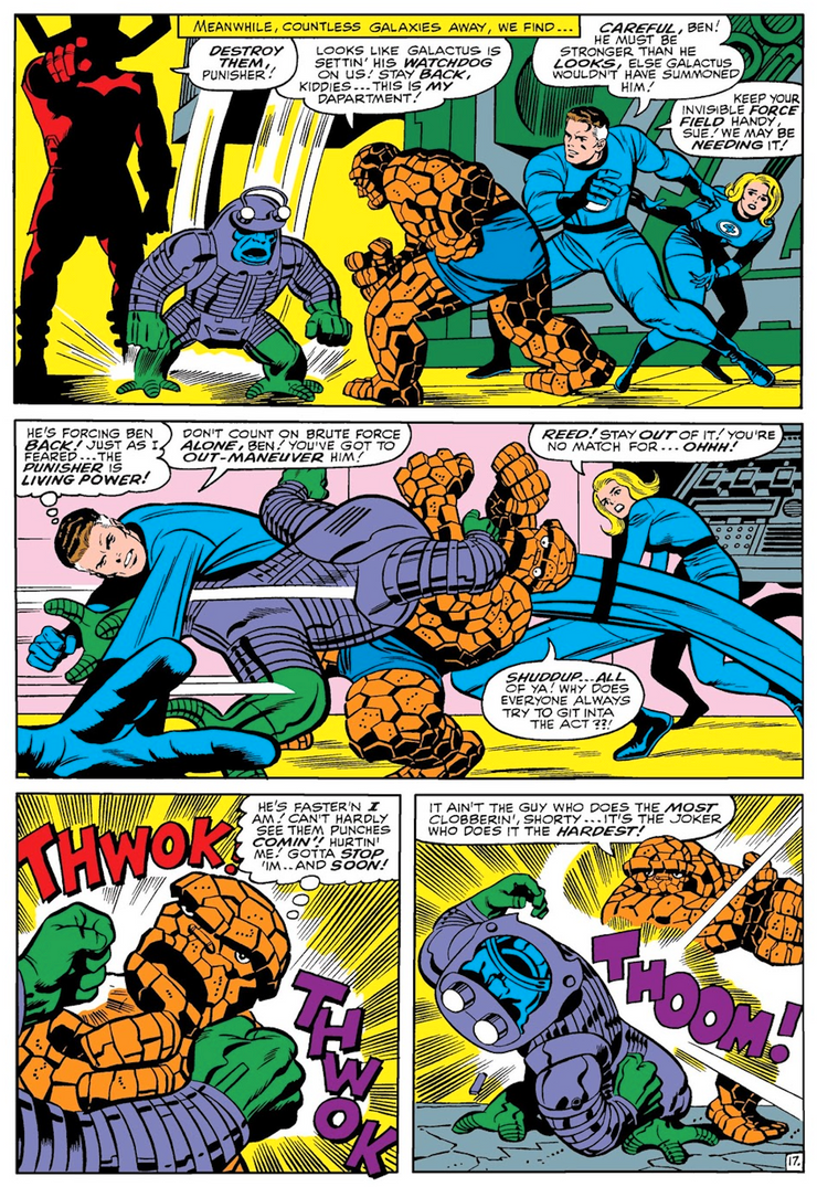 The Punisher se revela a sí mismo como una pequeña criatura parecida a una rana con un traje mecánico verde y morado. Inmediatamente aborda a todo el grupo y se empareja fácilmente con la Cosa. The Punisher también le quita el trabajo a Reed Richards, y Sue se da cuenta de que la única estrategia es que la pandilla se refugie en sus campos de fuerza. El Castigador golpea los escudos, manteniendo a raya a los tres héroes, hasta que Galactus le ordena al Castigador que se retire. “¡Suficiente, leal! ¡Vuelve al barco ahora! ¡Has cumplido tu propósito!” dice mientras termina su trabajo.