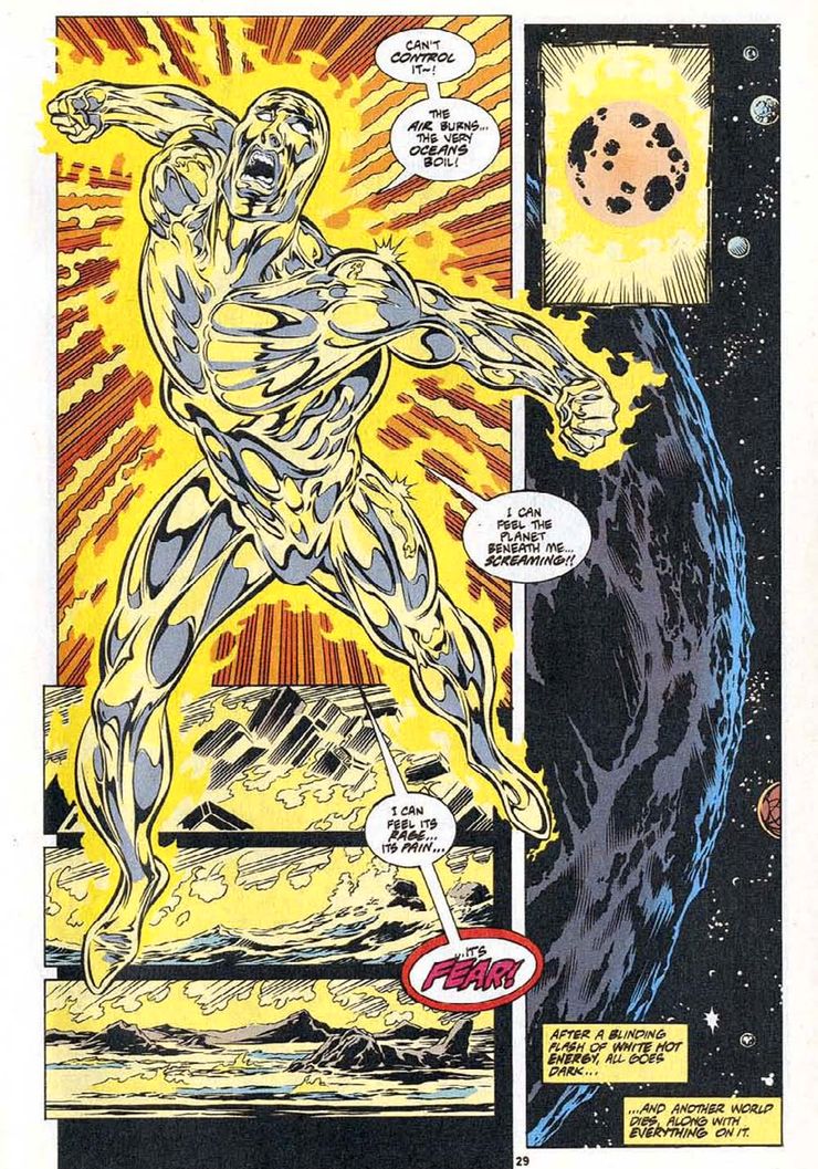 Galactus destruyó innumerables planetas, pero las acciones de su antiguo heraldo son mucho peores. Como Devorador, Galactus juega un papel en el orden cósmico, por lo que en realidad está atrapado en su propio destino trágico. Surfer, por otro lado, solo se movía por sus deseos egoístas. Incapaz de soportar el peso de sus pecados pasados, no pensó en las consecuencias de sus actos, cegado por su deseo de redención y perdón. Silver Surfer destruyó un mundo, matando a millones de almas vivientes, que murieron no porque fueran elegidos por el destino para ser víctimas de una fuerza cósmica de destrucción, sino porque un semidiós alienígena loco decidió convertirse en su salvador. Este episodio nunca se volvió a mencionar, lo cual es bastante desconcertante considerando que Silver Surfer pasa la mayor parte de su tiempo pensando en sus errores pasados.