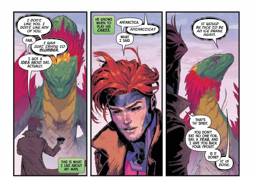 Gambit acepta devolverle el Ojo al dragón si pasa un año aislado en la Antártida sin comer a nadie. Incluso puede negociar más y pedirle un favor a Sadurang. El dragón acepta y les otorga a los mutantes reunidos una siniestra profecía sobre el futuro antes de irse volando. Toda esta escena es la síntesis perfecta de lo que convierte a Gambit en un actor de primera. Es la combinación de sus poderes, habilidad para robar, rapidez de pensamiento y encanto lo que lo convierte en un deleite. Para leer una y otra vez. Cuando el equipo no puede vencer a Sadurang en combate, él usa trucos para salvar el día.