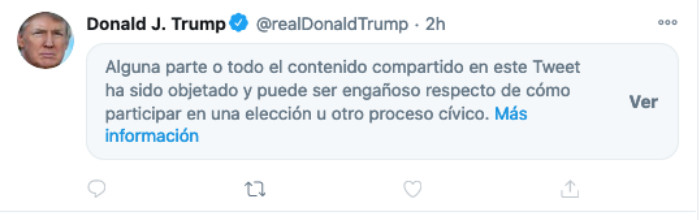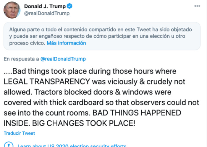 Twitter cubrió al menos cinco de los mensajes matutinos del presidente con la advertencia de que el contenido de estos “puede ser engañoso respecto de cómo participar en una elección o acto cívico”. Durante los días posteriores al 3 de noviembre, la red social ha recurrido en varias ocasiones a alertar a los usuarios sobre el contenido de los tuits de Trump.