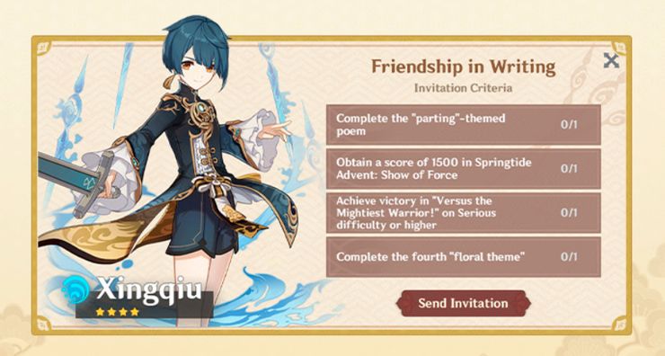 Hues of the Violet Garden contará con cuatro modos de juego diferentes: The Moon and Stars Inscribe, Theatre Mechanicus, Clash of Lone Blades y The Floral Courtyard. La línea de misiones “Legends of the Kasen” guiará a los jugadores a través de las diversas iteraciones de cada uno de estos modos de juego, y “Amistad en la escritura” es la línea de misiones que desbloqueará a Xingqiu como una invitación de personaje gratuita. Simplemente completar el resto de los modos de juego en Hues of the Violet Garden probablemente será suficiente para invitar a Xingqiu, quien tiene cuatro requisitos: completar el poema de despedida, obtener una puntuación de 1500 en Springtide Advent: Show of Force, lograr la victoria en “¡Contra el guerrero más poderoso!” en dificultad Seria o superior, y completando el cuarto tema floral del evento.