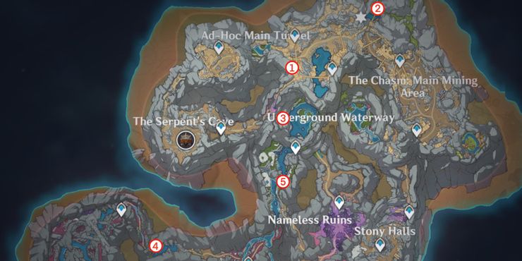 Fossil #1 se encuentra en el túnel principal Ad-Hoc. Los jugadores pueden tomar el Teleport Waypoint a su derecha y seguir el puente hacia el sur. El fósil estará custodiado por un grupo de acaparadores de tesoros sobre un muelle de madera. El fósil n. ° 2 se puede encontrar al norte de The Chasm: Main Mining Area. Se puede acceder siguiendo las plataformas hacia arriba y sobre el pequeño lago. El fósil #3 será el más difícil de encontrar. Los jugadores deberán teletransportarse al canal subterráneo y dirigirse a la sección sobre la cascada. Al usar el tótem Anemo, los jugadores pueden crear una corriente de viento que pueden usar para subir a una plataforma rocosa en la parte superior de la caverna.