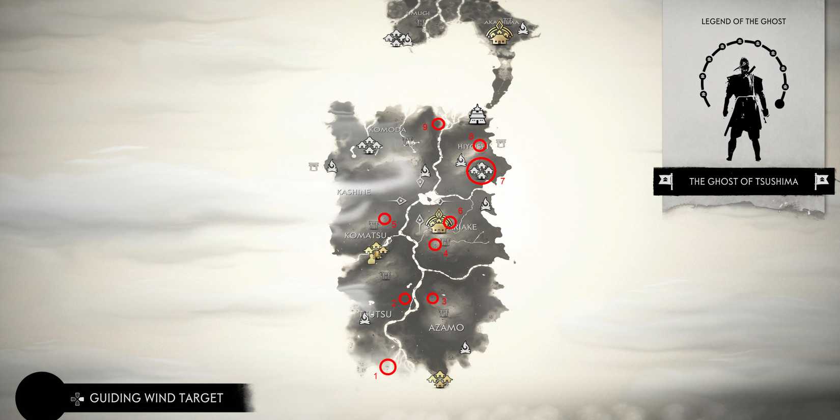Todas las aguas termales de la región de Kamiagata están marcadas en el mapa de arriba. Kamiagata es donde se desarrolla el Acto 3 de Fantasma de Tsushima tiene lugar. Consulte la siguiente tabla para ver imágenes ampliadas y descripciones más detalladas de cómo encontrar cada fuente termal:
