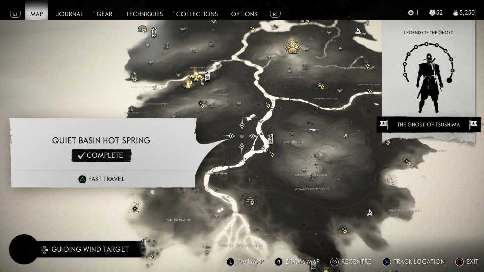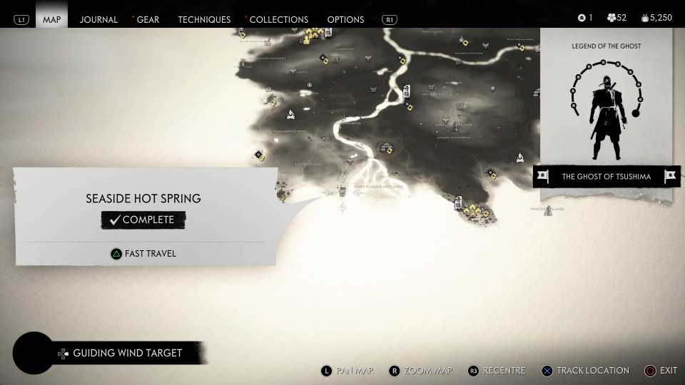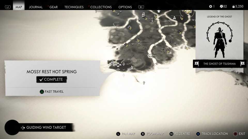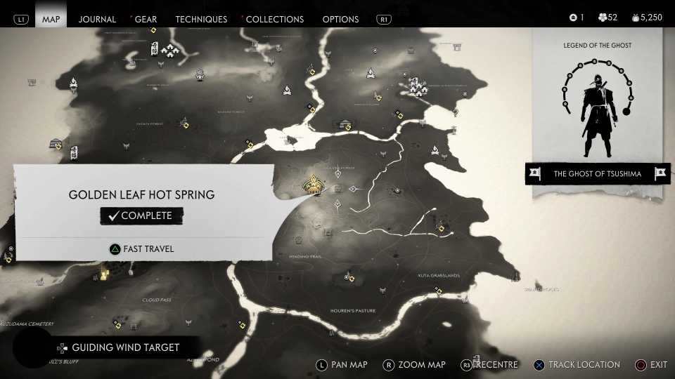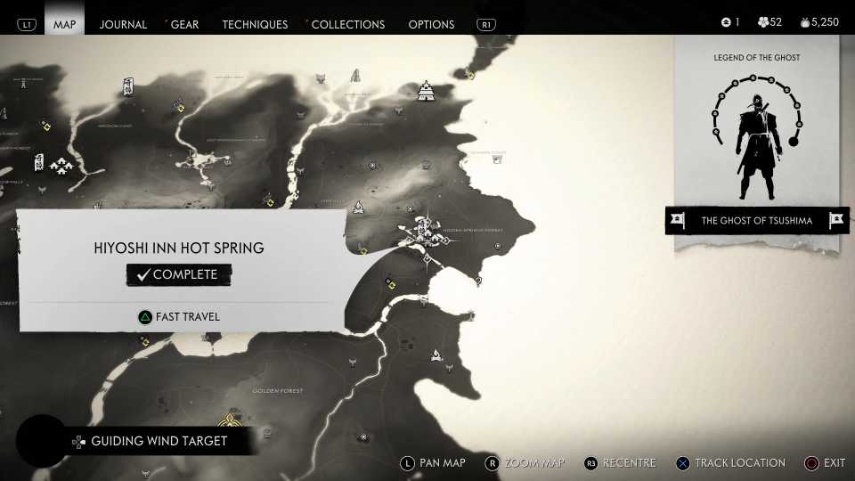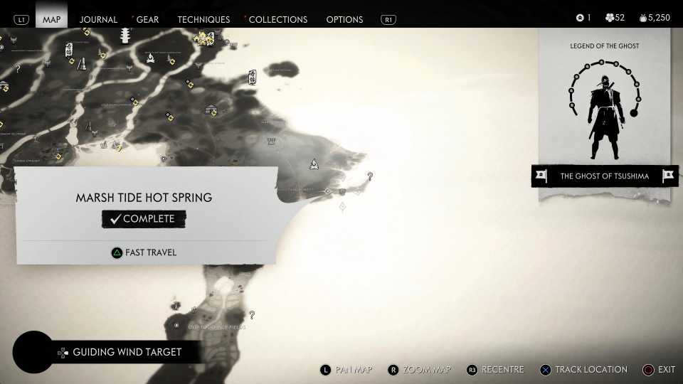 También es necesario encontrar todas las aguas termales para desbloquearlas. Fantasma de Tsushima Trofeo Cuerpo, Mente y Espíritu; sin embargo, esto también requiere encontrar otros objetos coleccionables, incluidos Haiku, Inari Shrines y Bamboo Strikes.