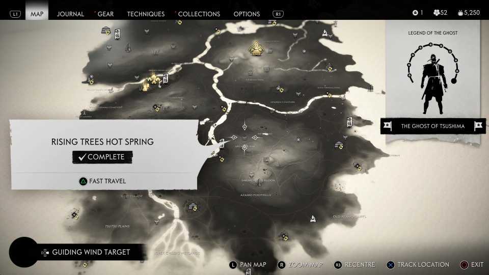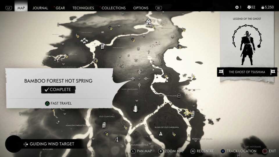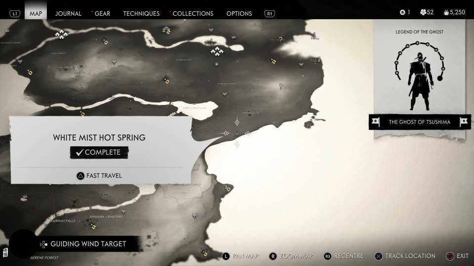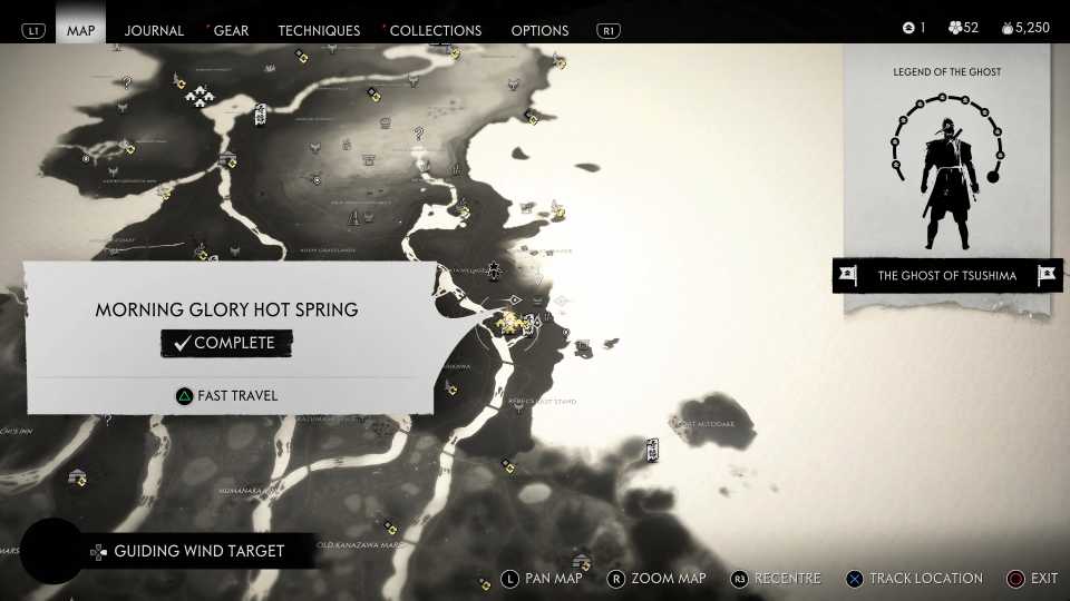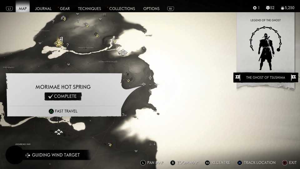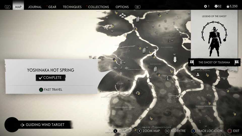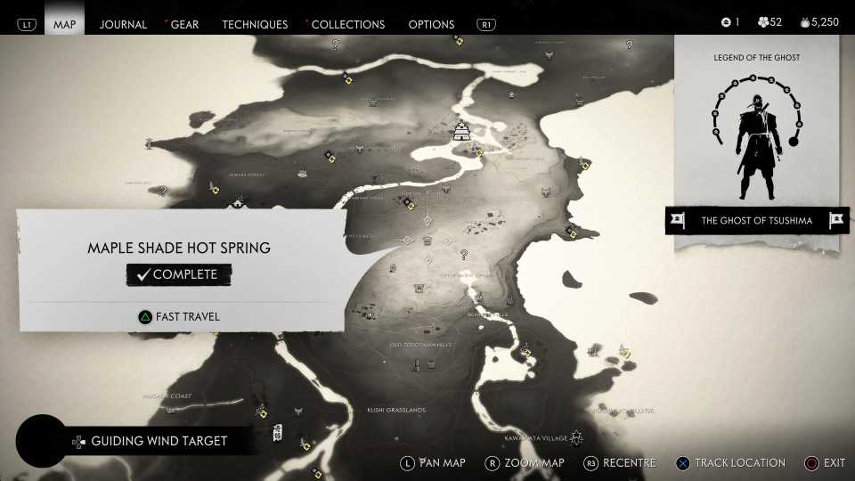 También es necesario encontrar todas las aguas termales para desbloquearlas. Fantasma de Tsushima Trofeo Cuerpo, Mente y Espíritu; sin embargo, esto también requiere encontrar otros objetos coleccionables, incluidos Haiku, Inari Shrines y Bamboo Strikes.