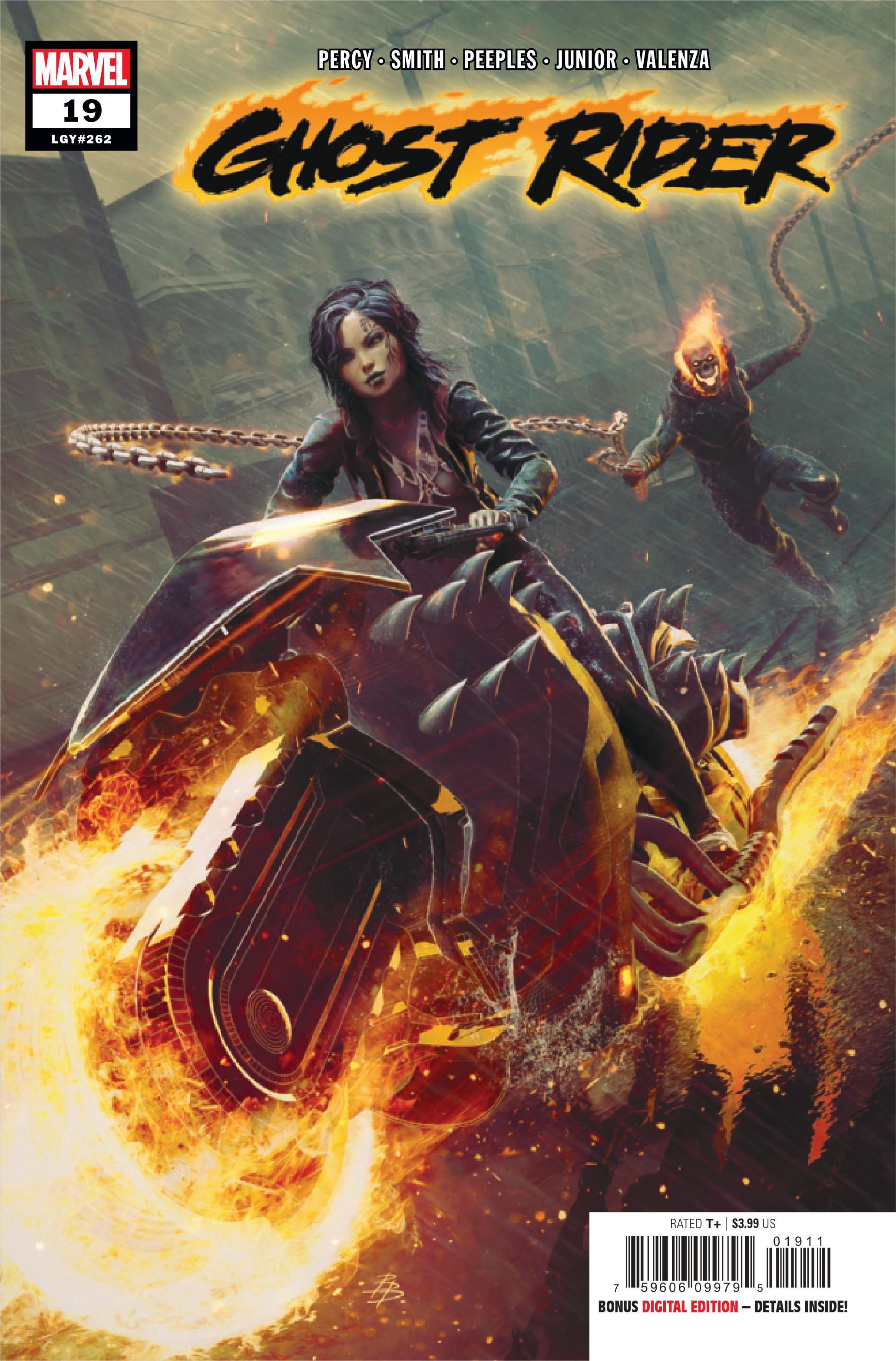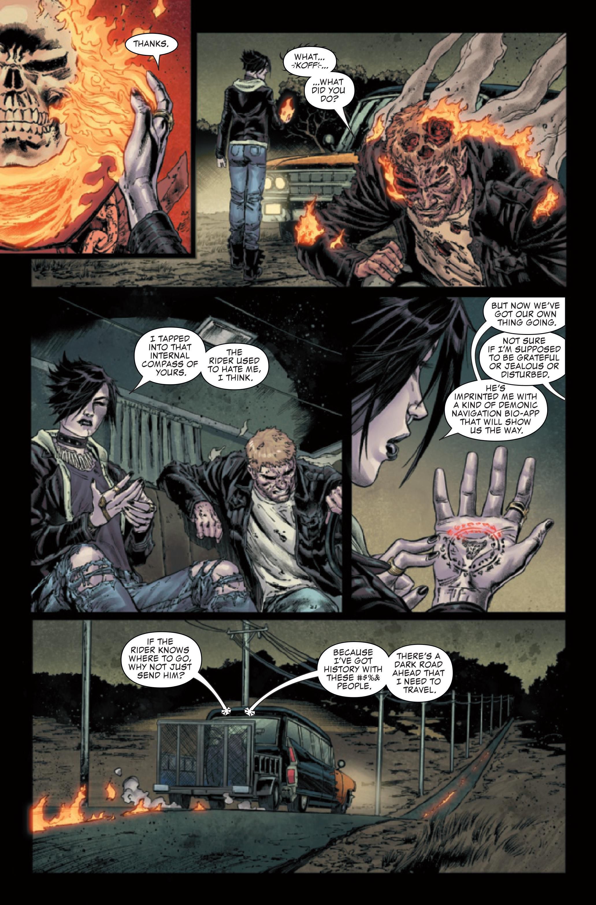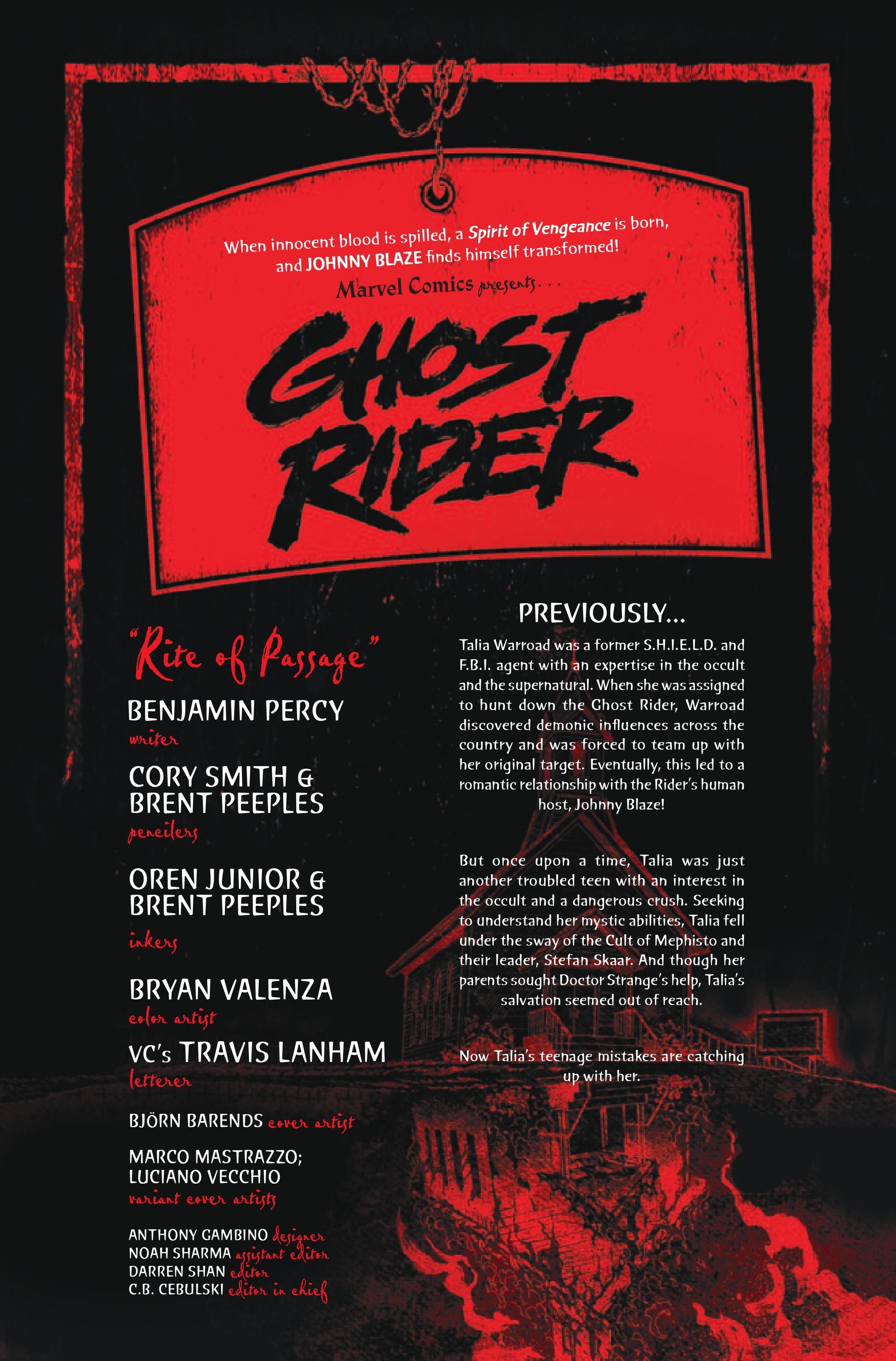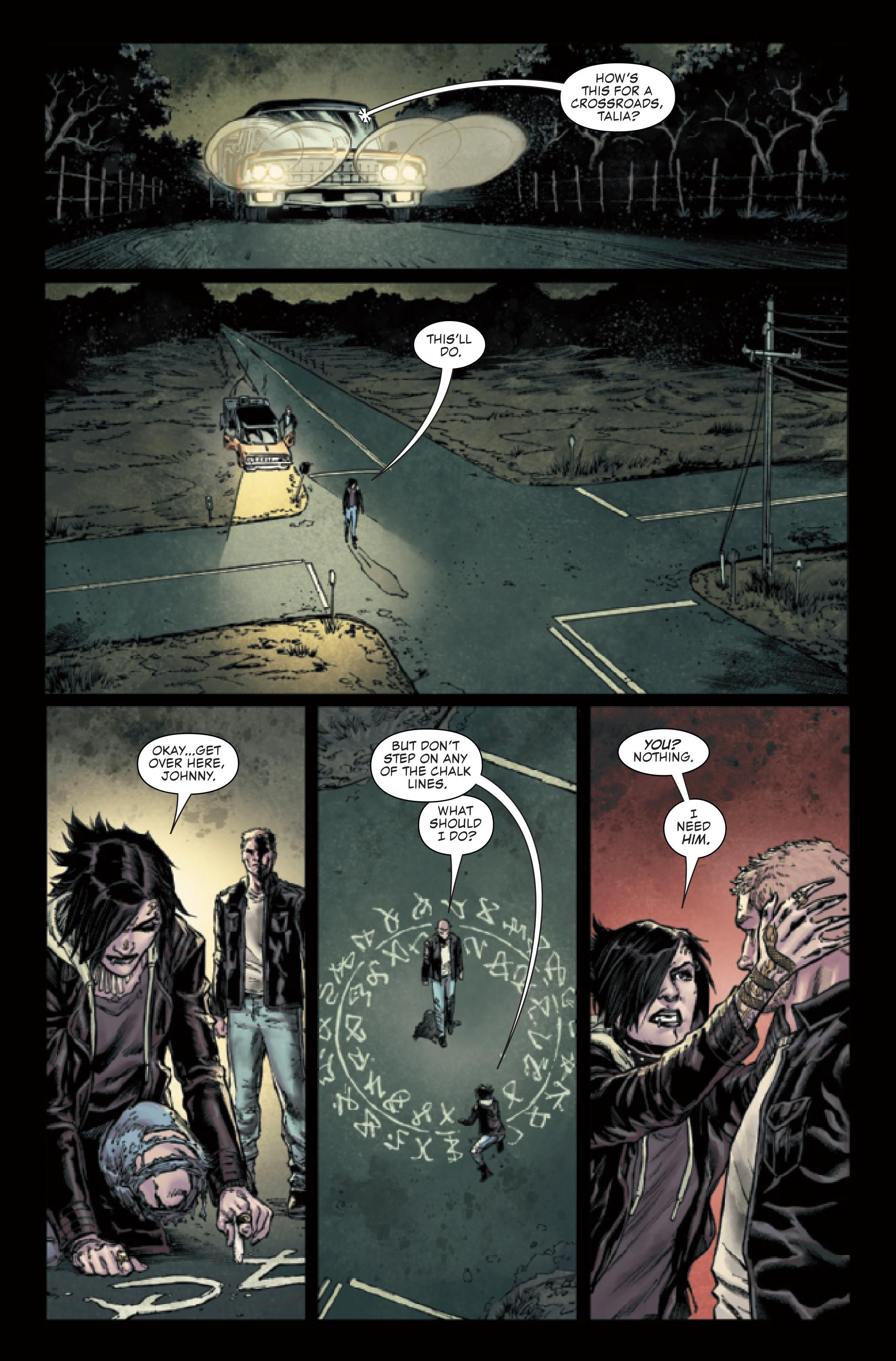 Jinete Fantasma El número 19 está escrito por Benjamin Percy y dibujado por Cory Smith y Brent Peeples. Talia y Johnny Blaze están buscando el Culto de Mephisto, al que Talia pertenecía cuando era joven. Lleva a Johnny a un cruce de caminos y dibuja glifos en el pavimento. Johnny entra al círculo y Talia induce una transformación en Ghost Rider. Ella le pide que rastree el Culto de Mephisto y coloca sus manos sobre su cabeza en llamas. Ghost Rider localiza el Culto y quema un mapa en las manos de Talia. Vuelve a convertirse en Johnny, quien está sorprendido por el vínculo que ahora comparte Talia con Ghost Rider.